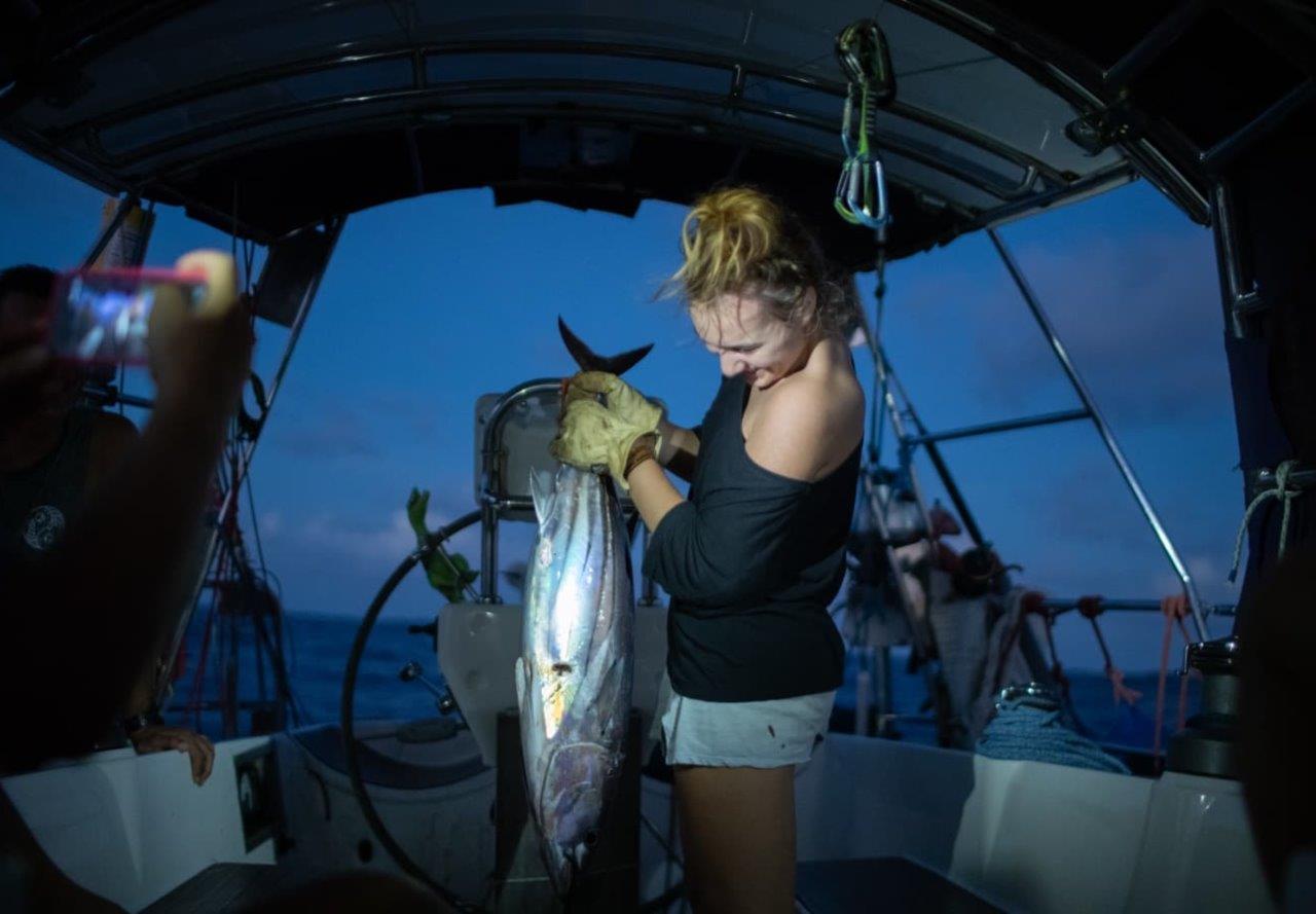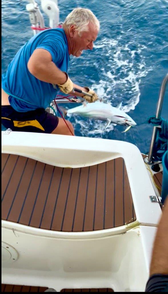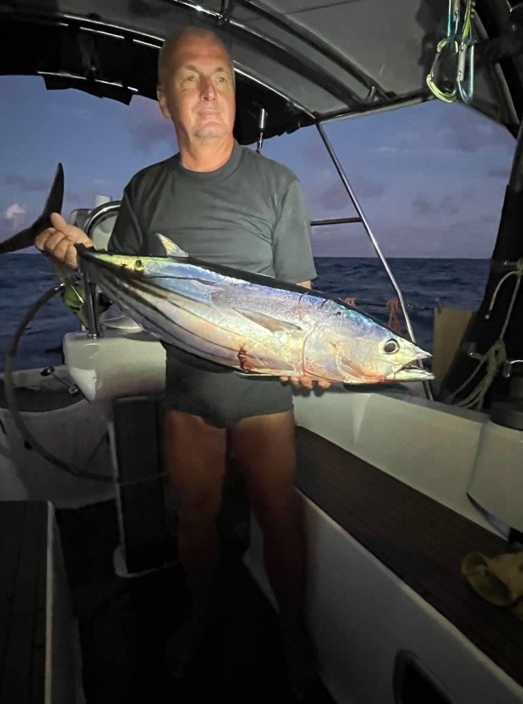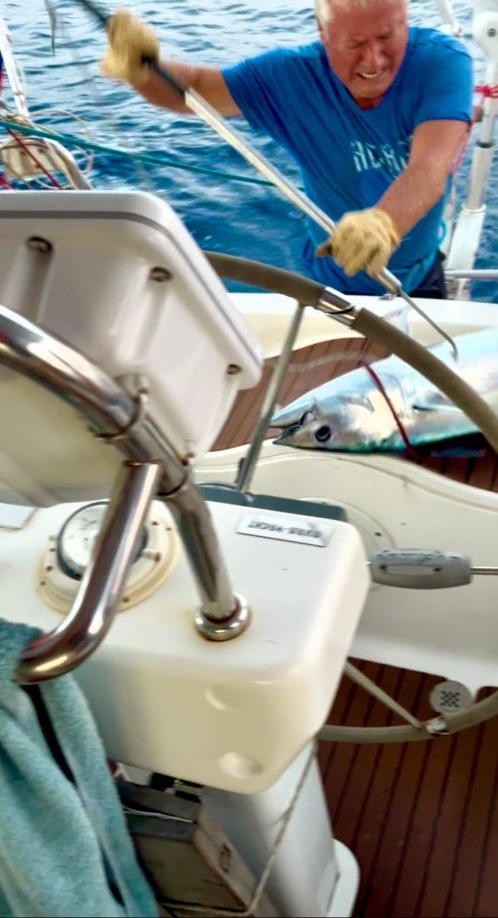 Mimochodom, biely genaker voláme „Biela mulica“ pre jeho pevnosť, s akou odolával nárazom vetra. Malý genaker z Trintelly voláme „Lietajúci Holanďan“. Je totiž vo farbách holandskej zástavy a prekrásne si pred sťažňom poletuje a nemá na neho vplyv rozkývaná loď. Parasailor zatiaľ zostáva „Parasailor“. No a nakoniec sa nám podaril prekrásny tuniačik.