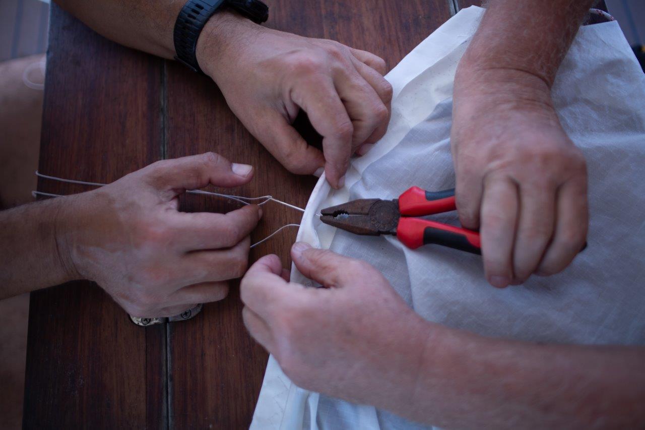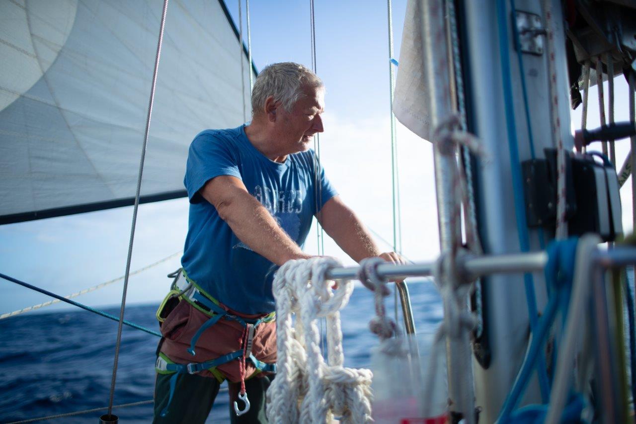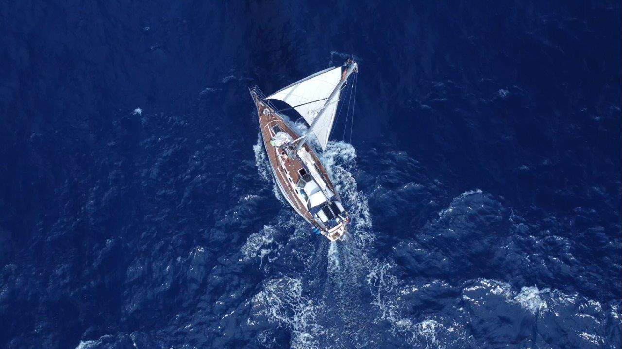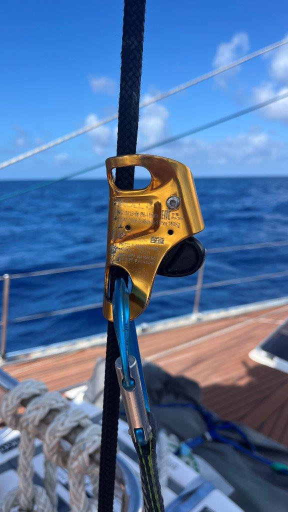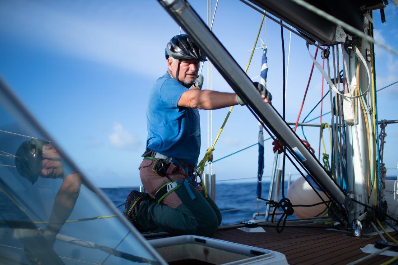 Kukám na to a v hlave sa mi rozsvecuje. Rana, čo sme počuli, bola spôsobená utrhnutím kladky z jej lôžka hore, na päte sťažňa. Lano ostalo viseť na mieste, kde vychádza zo sťažňa. No paráda. Neskôr som videl, že 5 mm hrubý nerez na vrchole sťažňa, v otvore, v ktorom visela kladka, sa neuveriteľne rokmi predral. Napokon, aj šekel na kladke je poriadne načatý. Nasleduje postup známy z aprílového Atlantiku. Hore na sťažeň a zavesiť nový výťah na pravej strane, idúci mimo sťažňa. Nakoniec som bol hore trikrát. Prvý raz výmena, no aj keď sme poistili lano, aby sa nedrelo o sťažeň, napodiv sa predralo po dni a pol na kladke pri sťažni. Tá bola našimi úpravami šikmo a tam bol problém. Druhýkrát opäť nové lano, ale aj to sa nám predralo. Tentokrát pri kladke. Tretíkrát ešte drobné úpravy hore aj dole a odvtedy je pokoj. František to natočil s dronom a vyzeralo to takto.