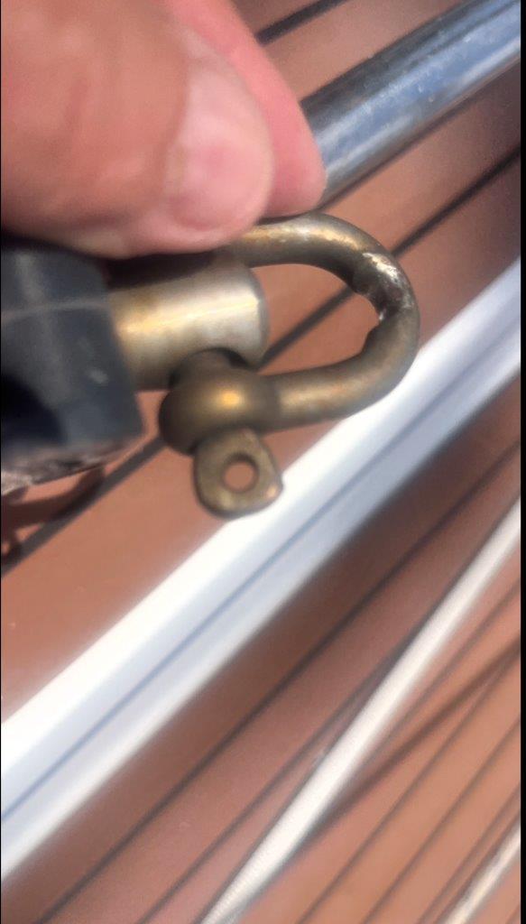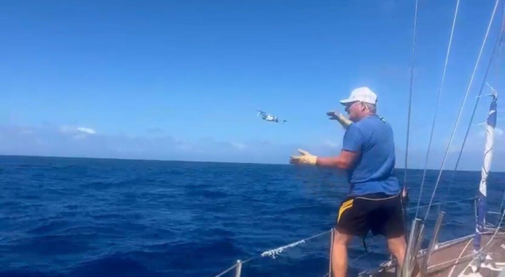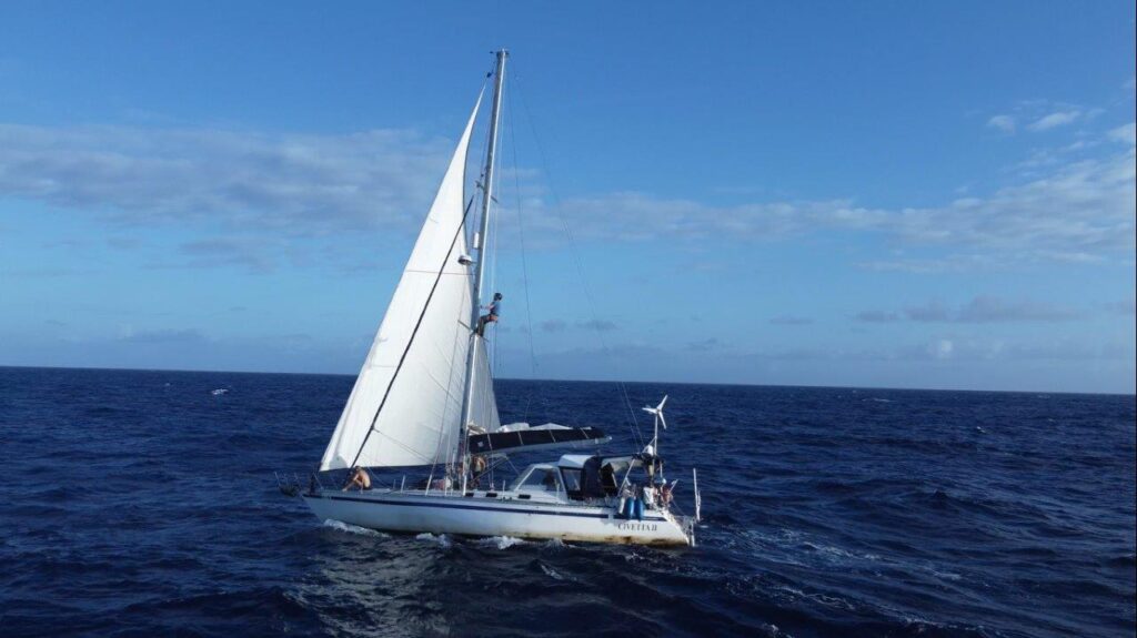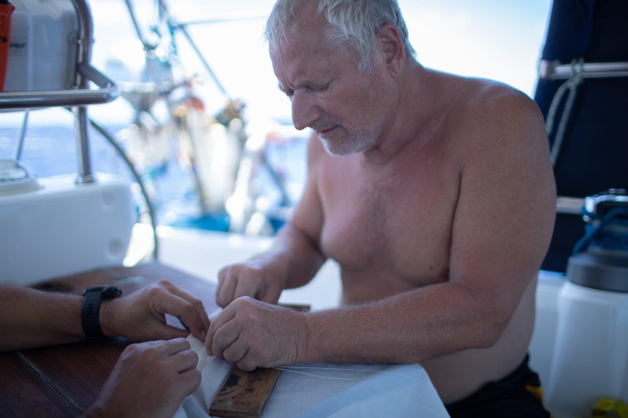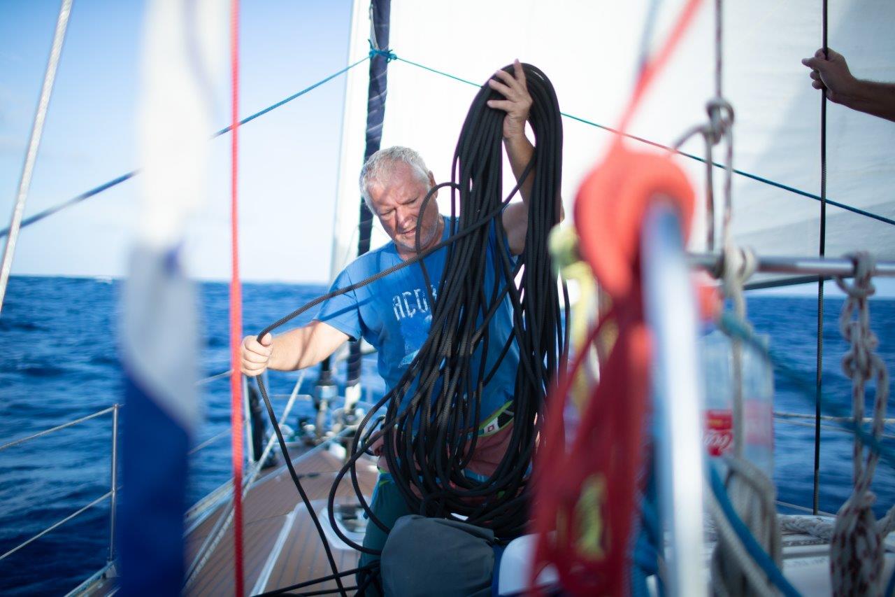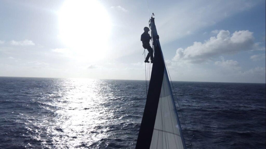 Kukám na to a v hlave sa mi rozsvecuje. Rana, čo sme počuli, bola spôsobená utrhnutím kladky z jej lôžka hore, na päte sťažňa. Lano ostalo viseť na mieste, kde vychádza zo sťažňa. No paráda. Neskôr som videl, že 5 mm hrubý nerez na vrchole sťažňa, v otvore, v ktorom visela kladka, sa neuveriteľne rokmi predral. Napokon, aj šekel na kladke je poriadne načatý. Nasleduje postup známy z aprílového Atlantiku. Hore na sťažeň a zavesiť nový výťah na pravej strane, idúci mimo sťažňa. Nakoniec som bol hore trikrát. Prvý raz výmena, no aj keď sme poistili lano, aby sa nedrelo o sťažeň, napodiv sa predralo po dni a pol na kladke pri sťažni. Tá bola našimi úpravami šikmo a tam bol problém. Druhýkrát opäť nové lano, ale aj to sa nám predralo. Tentokrát pri kladke. Tretíkrát ešte drobné úpravy hore aj dole a odvtedy je pokoj. František to natočil s dronom a vyzeralo to takto.