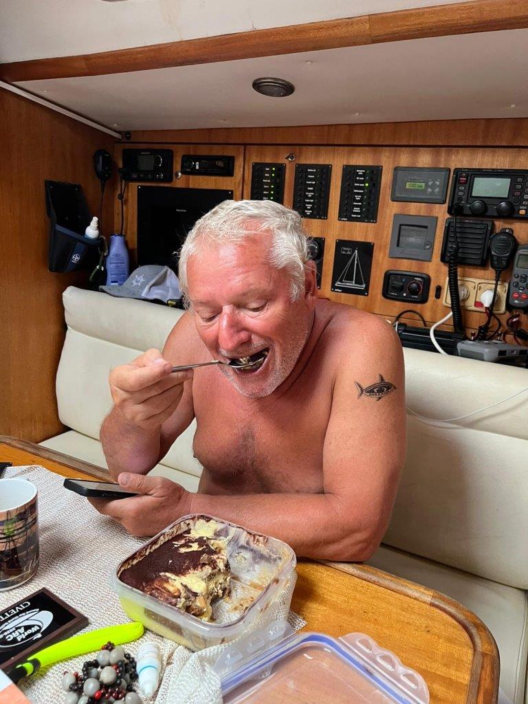 Poobede, už na lodi, sme dosť uťahaní, to teplo vie odrovnať. Napriek únave ale dostávam darček, tiramisu. Dnes 2. apríla mám totiž narodeniny, 65 rokov.