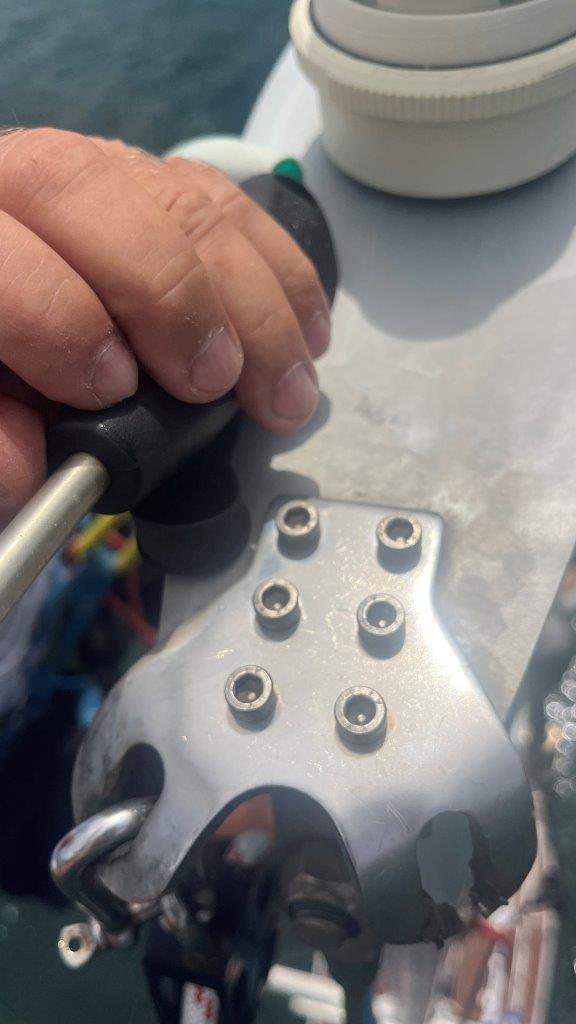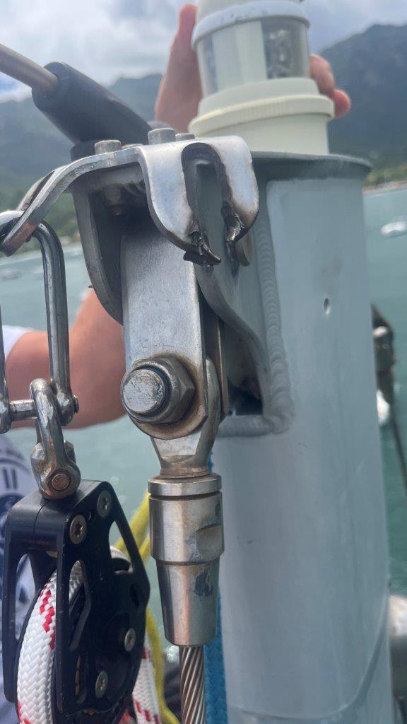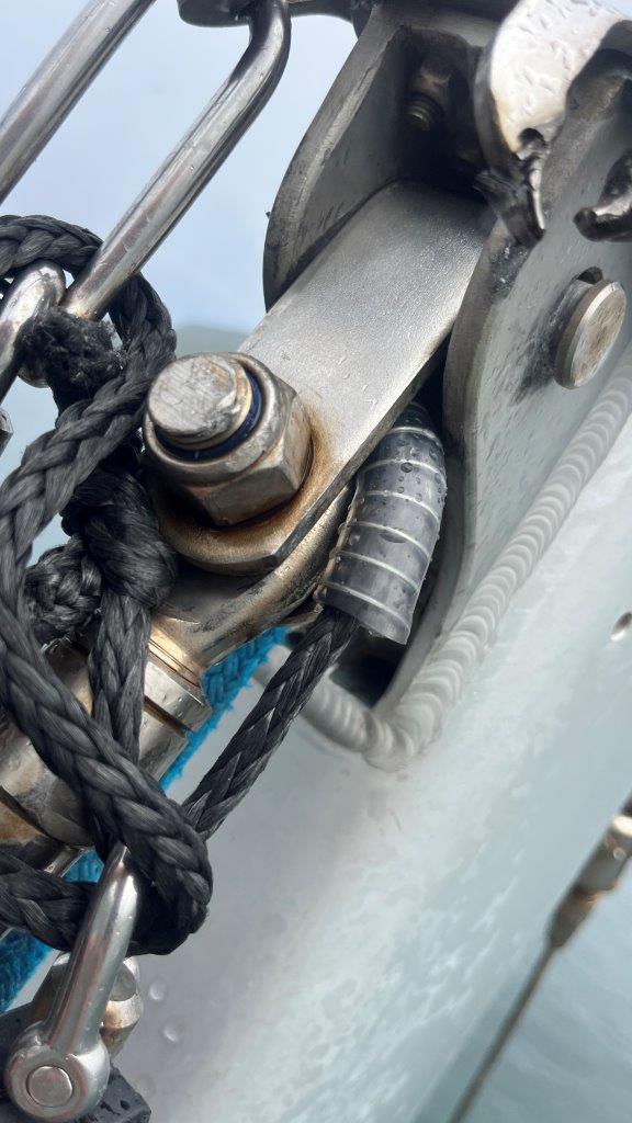 3. apríla pracujeme. Mám niekoľko „výjazdov” na sťažeň, kým som vymyslel a urobil náhradný záves kladky výťahu genakra. Neuveriteľné, počas 15 rokov 4 mm hrubý Inox prepílil šekel s kladkou… Vyriešil to dočasne kus hadice a kevlarové lano.