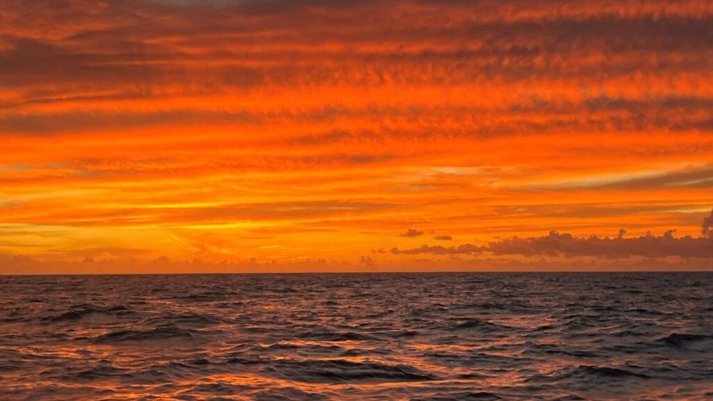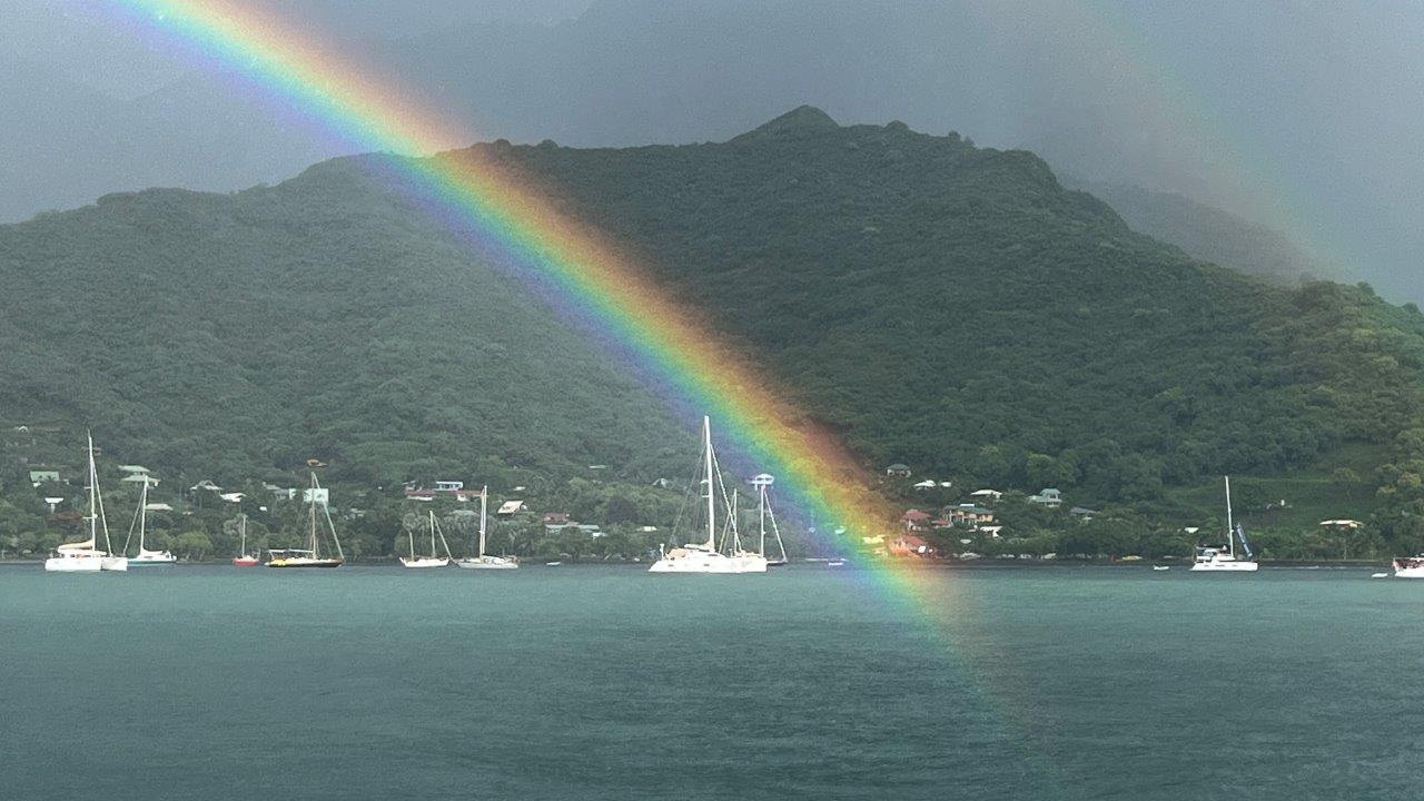 Musíme si dávať pozor, často kontrolovať filtre, aby motor nevysadil v najmenej vhodnej chvíli. Napodiv, potraviny sú otvorené, zásobujeme loď na týždňovú plavbu. Ráno 6. apríla prečkáme lejak a fotíme sýte, dúhové farby.