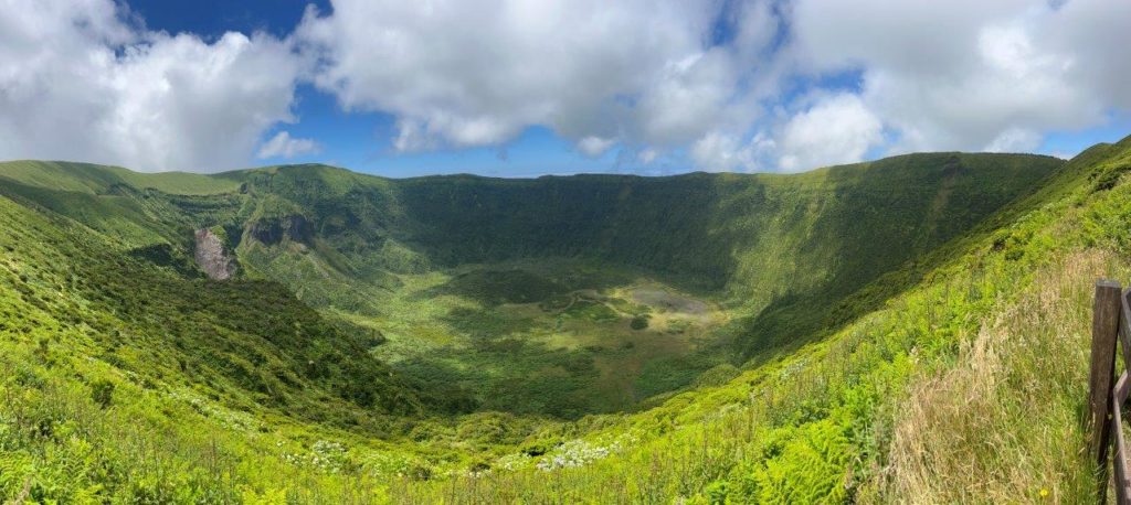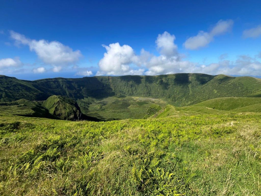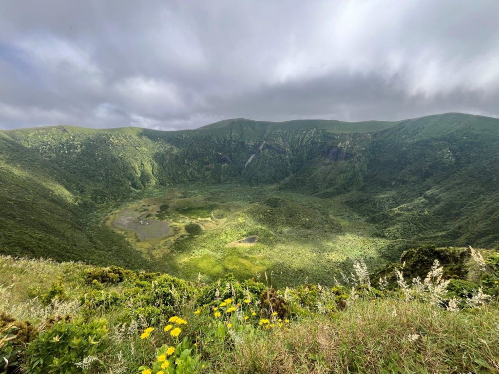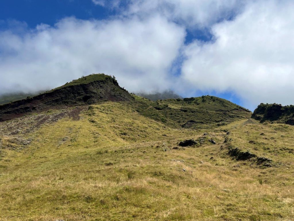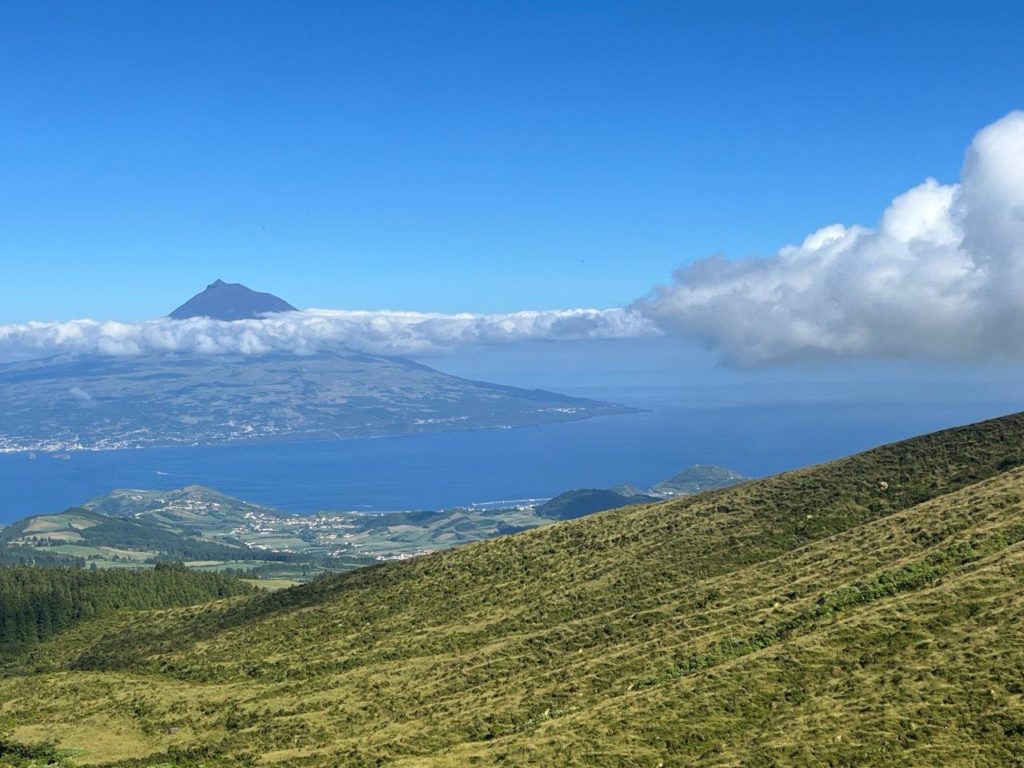 Autom sme sa presunuli ku kráteru „Caldeira“, ktorý je vrcholom ostrova. Kráter má obvod 6 kilometrov a my sme neodolali 2,5-hodinovej túre. V pozadí Pico, 2400 metrov vysoká spiaca sopka, z ktorej sa stále dymí, na neďalekom rovnomennom ostrove.