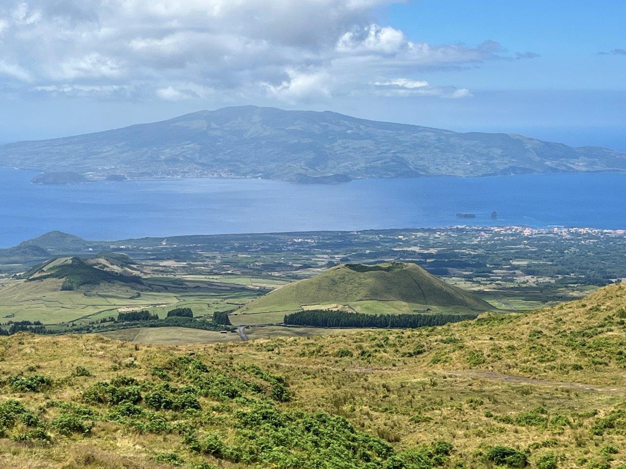 Autom sme sa presunuli ku kráteru „Caldeira“, ktorý je vrcholom ostrova. Kráter má obvod 6 kilometrov a my sme neodolali 2,5-hodinovej túre. V pozadí Pico, 2400 metrov vysoká spiaca sopka, z ktorej sa stále dymí, na neďalekom rovnomennom ostrove.