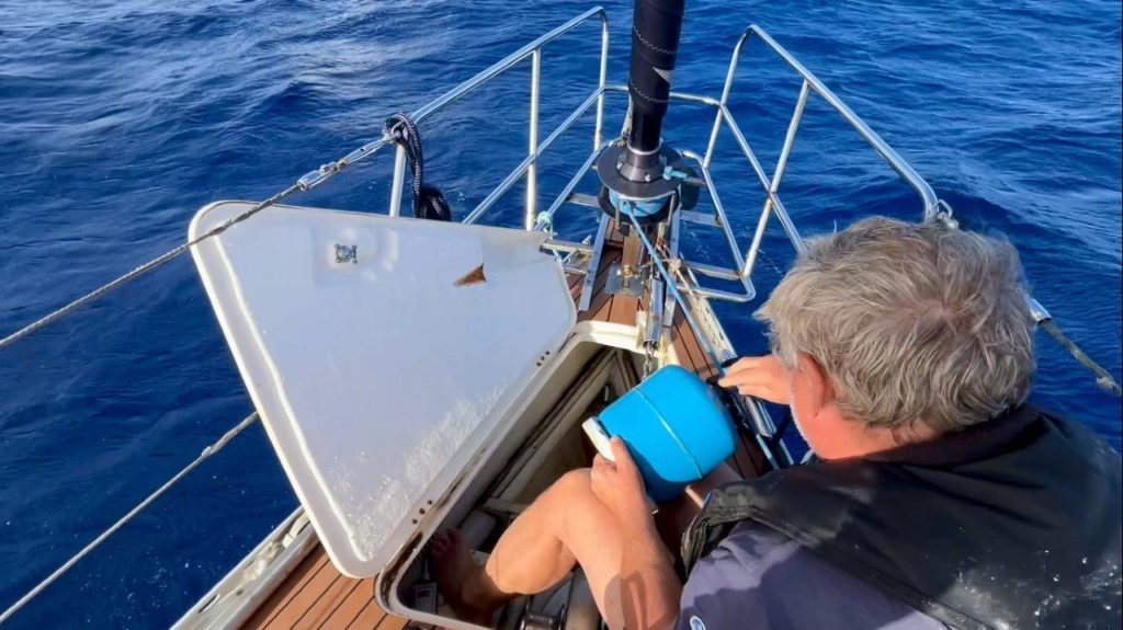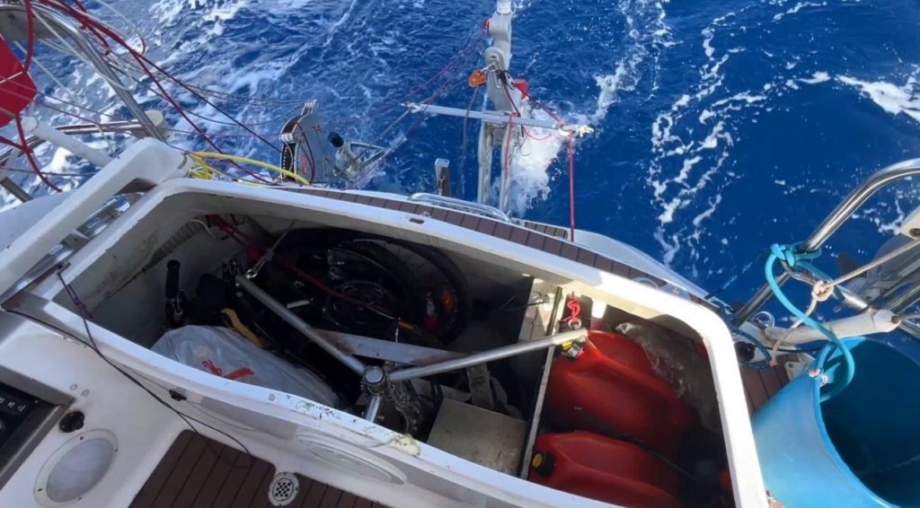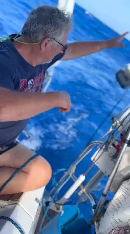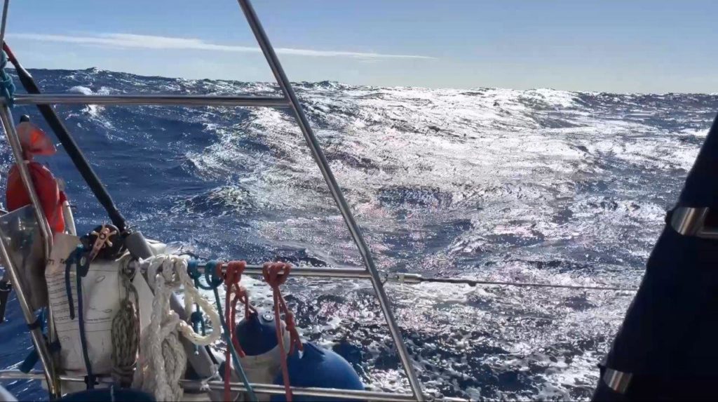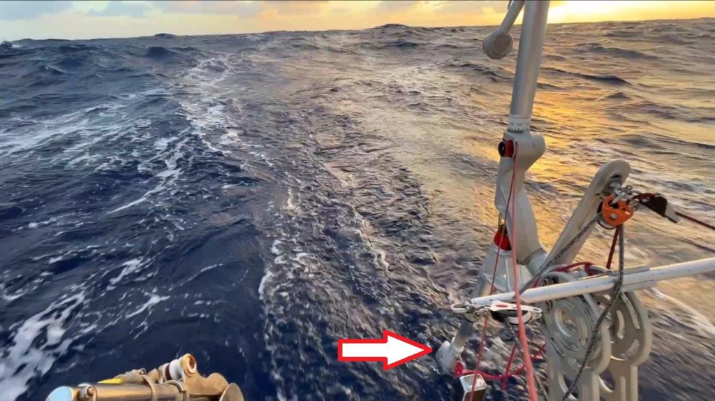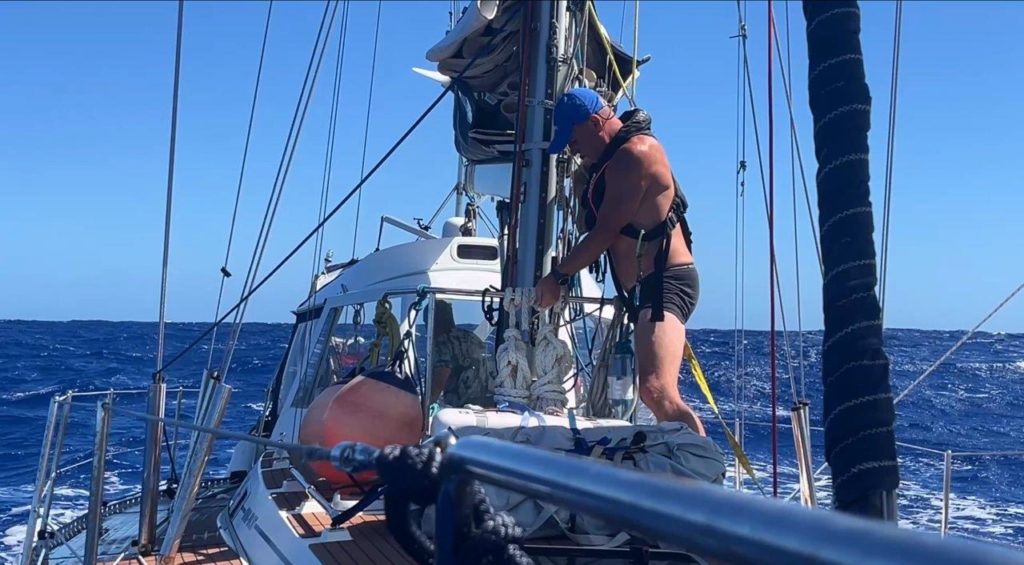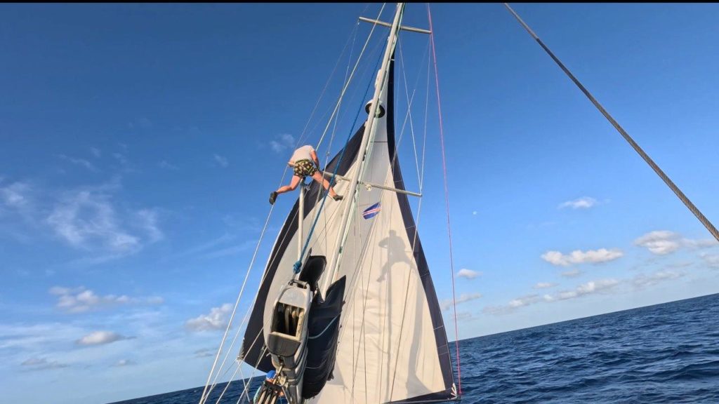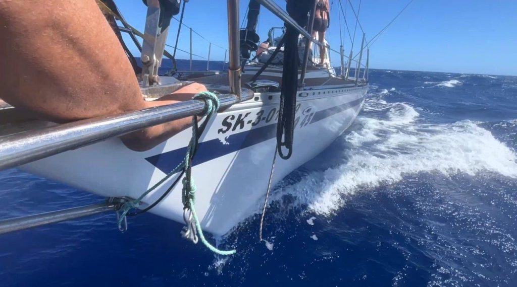 Donedávna sme s priamou plavbou v zadnom vetre nemali problém. Predné plachty na motýľa s pňami a išlo to ako po masle. Ibaže upevnenie pňa sa ulomilo na koľajnici na sťažni. Nič, čo nevieme spraviť, ale na to potrebujeme pokojnú vodu. Peň ostal hore zaseknutý, nedalo sa inak, iba ísť k nemu, uvoľniť a spustiť na palubu, kde ho Tomáš zachytil a spoločne sme ho potom uviazali na palube.