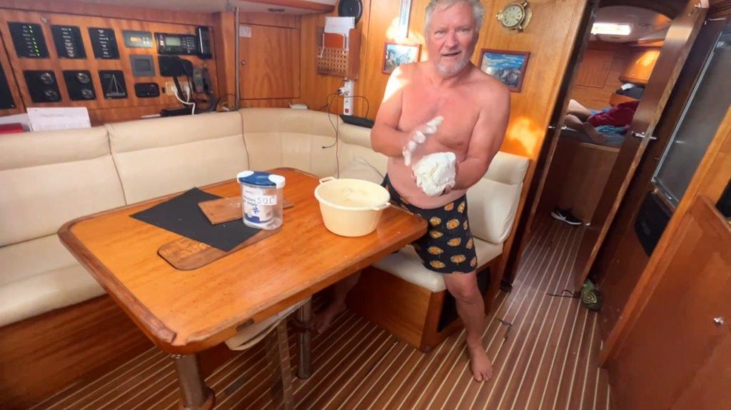 Trvá to polhodinku, mrak prejde ponad nás. Za nami je ďalší, možno dva, a potom je celý deň a noc vietor stabilný. Pred dvoma dňami som sa po prvotnom váhaní postavil nahý do lejaka a spáchal očistu v sladkej vode. Veľmi sa mi nechcelo, veď komu by sa chcelo o piatej ráno za tmy, keď fúka tridsiatka, rovno do rozhúpaného kokpitu? Ale ten pocit potom, nebyť polepený, za to stál. Inak si tu celkom fajn nažívame. Plánujeme večeru, menili sme plynovú bombu, pečiem chlebík, umývame riady, občas čosi upevňujeme na palube.
