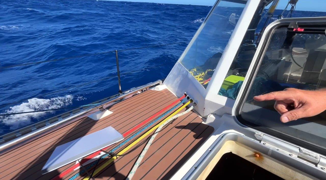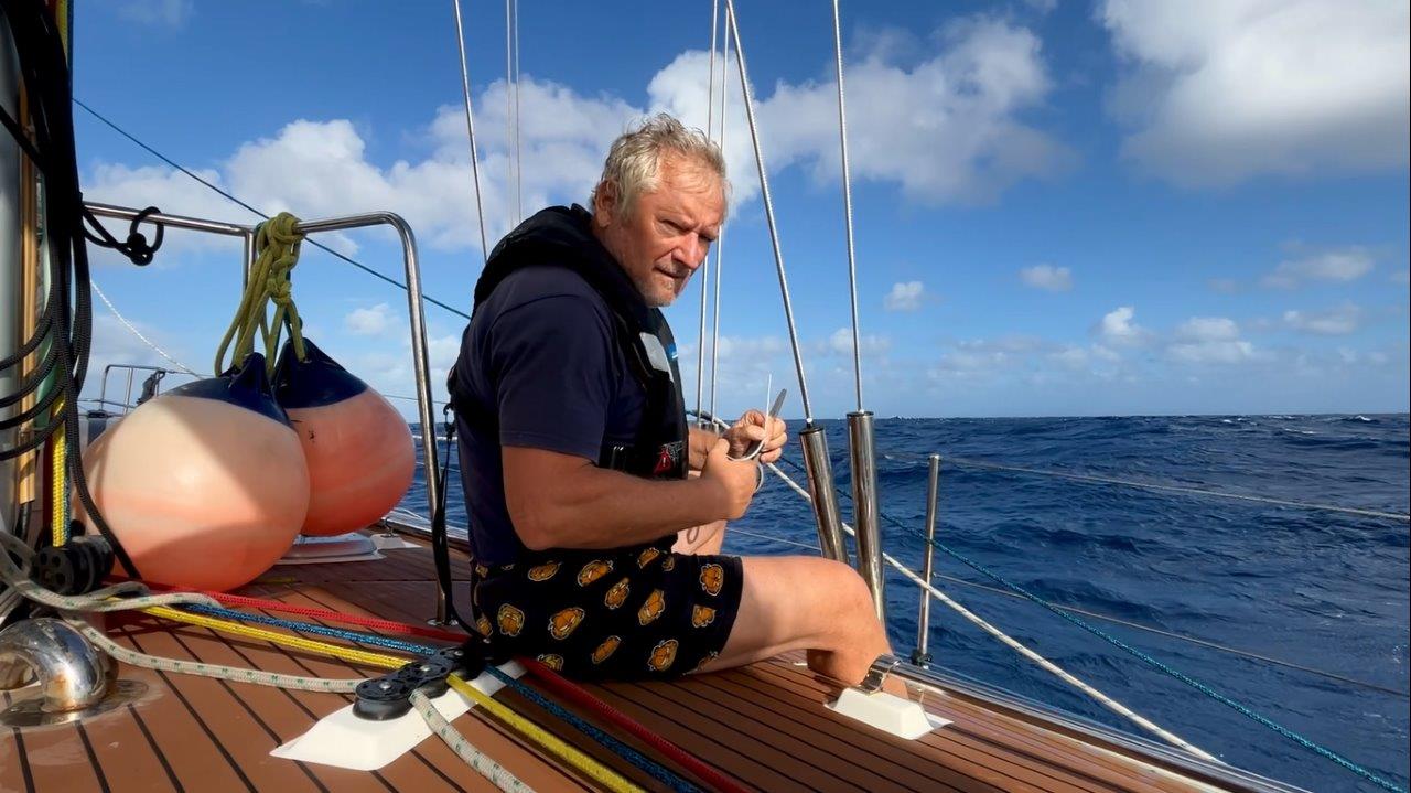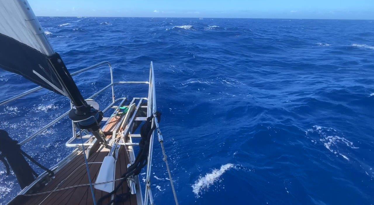 Donedávna sme s priamou plavbou v zadnom vetre nemali problém. Predné plachty na motýľa s pňami a išlo to ako po masle. Ibaže upevnenie pňa sa ulomilo na koľajnici na sťažni. Nič, čo nevieme spraviť, ale na to potrebujeme pokojnú vodu. Peň ostal hore zaseknutý, nedalo sa inak, iba ísť k nemu, uvoľniť a spustiť na palubu, kde ho Tomáš zachytil a spoločne sme ho potom uviazali na palube.